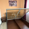 Dormitor cu pat cu somiera rabatabila cu loc de depozitare, mobilier, TV, perdele, draperie.
